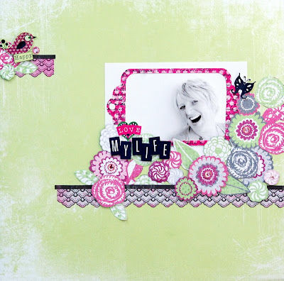 The title 1973 was stamped using Glitz stamps and I created lots of paper roses using scraps of Glitz paper and added swirly Glitz Frosting to complete the page.