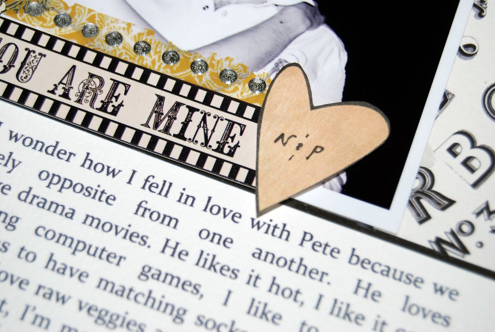 For my next layout, I tried a few different techniques to spark up my layout. The first thing I did was scrape the top of my Glitzer to distress it a bit and then I hand-cut the heart from a piece of the paper layers and hand wrote N&P.