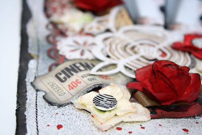 Other Supplies: Black Cardstock, Petaloo Flowers, Red Acrylic Paint, Raven Glimmer Mist, Ranger Crackle Medium,Tim Holtz Black Soot Distress Ink, Lace from my stash